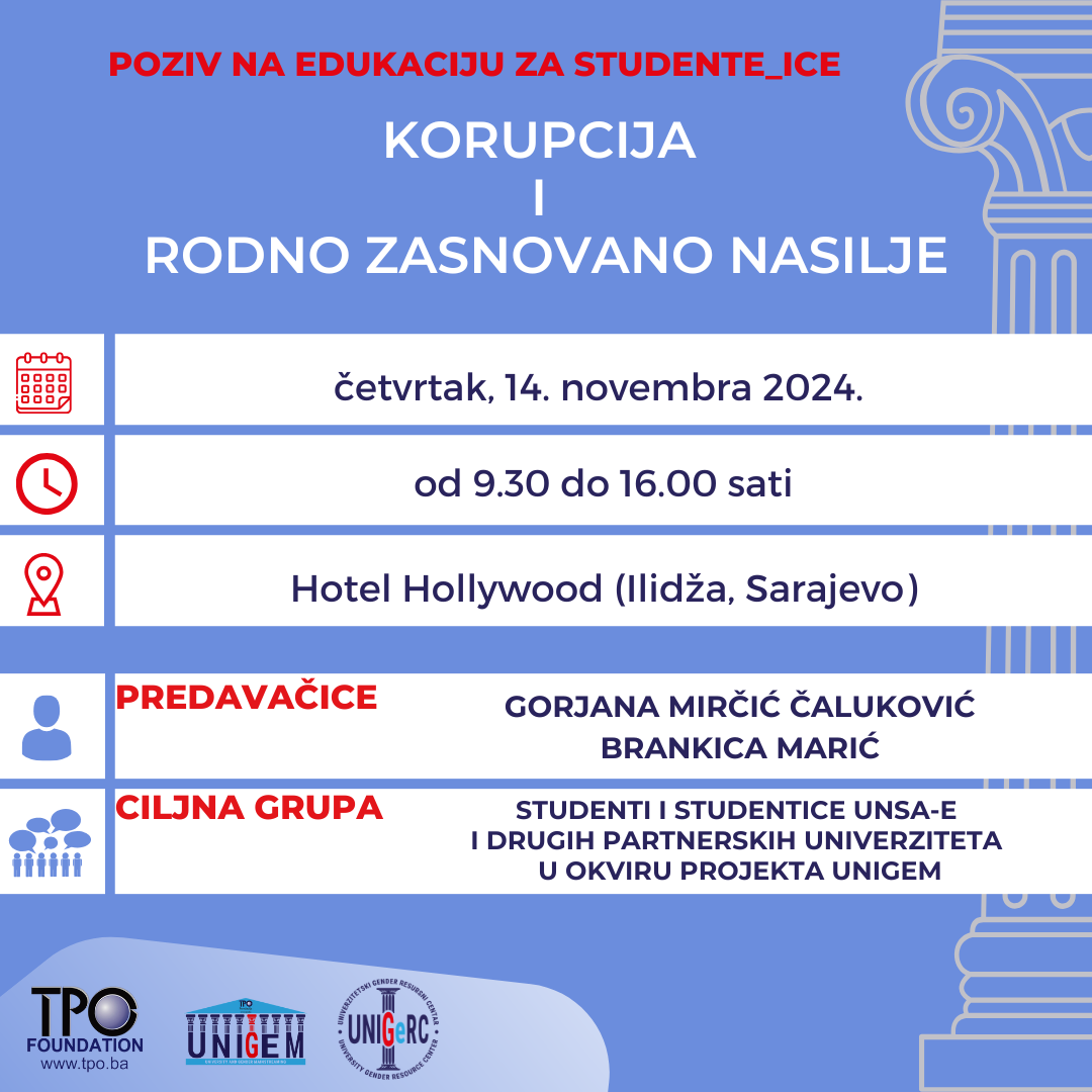 U okviru UNIGEM projekta, TPO fondacija u saradnji sa Centrom za ljudska prava Univerziteta u Sarajevu i Univerzitetskim gender resursnim centrom (UNIGeRC), organizira jednodnevnu edukaciju "Korupcija i rodno zasnovano nasilje".
