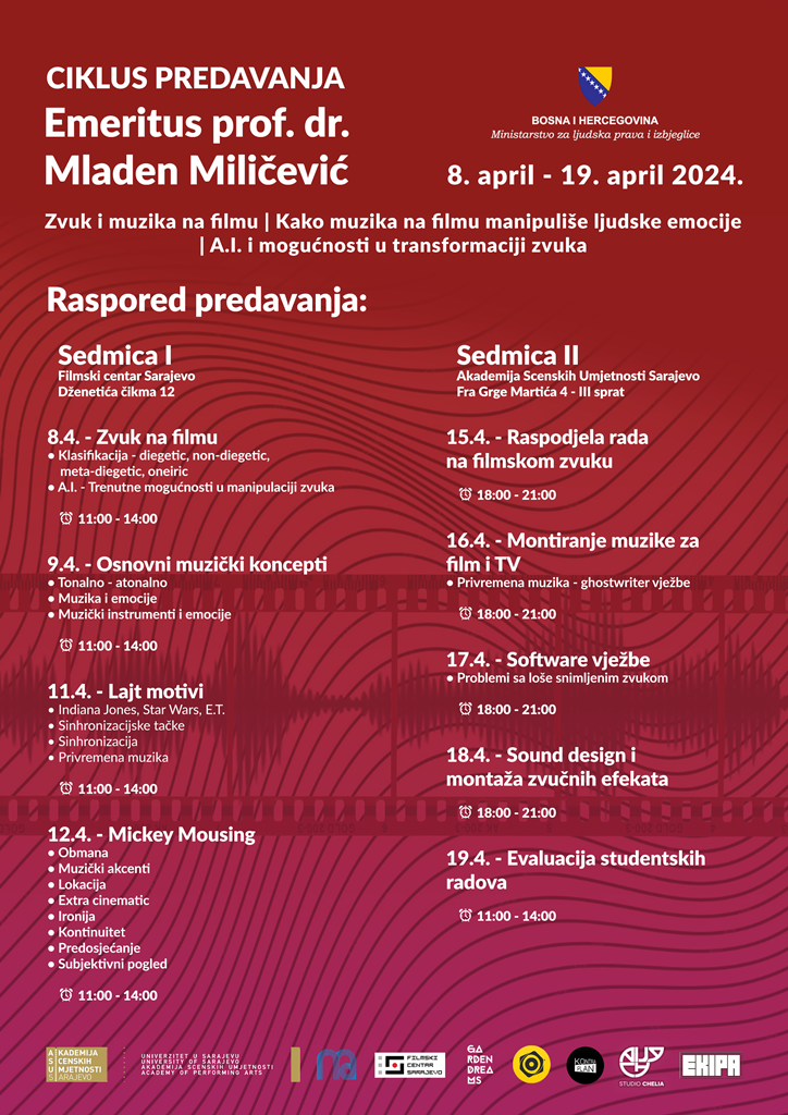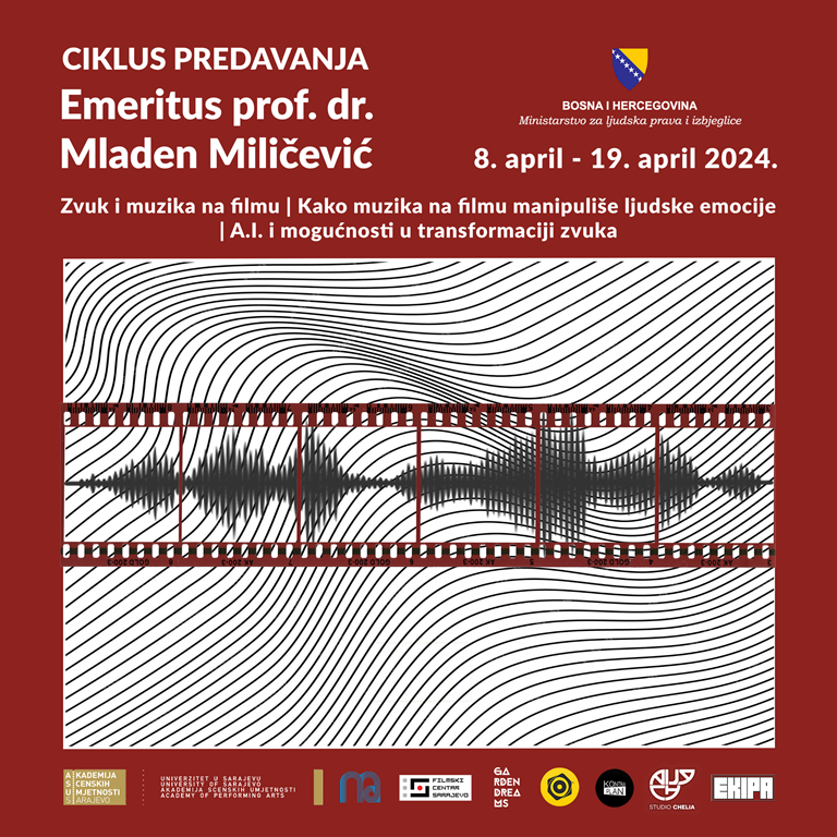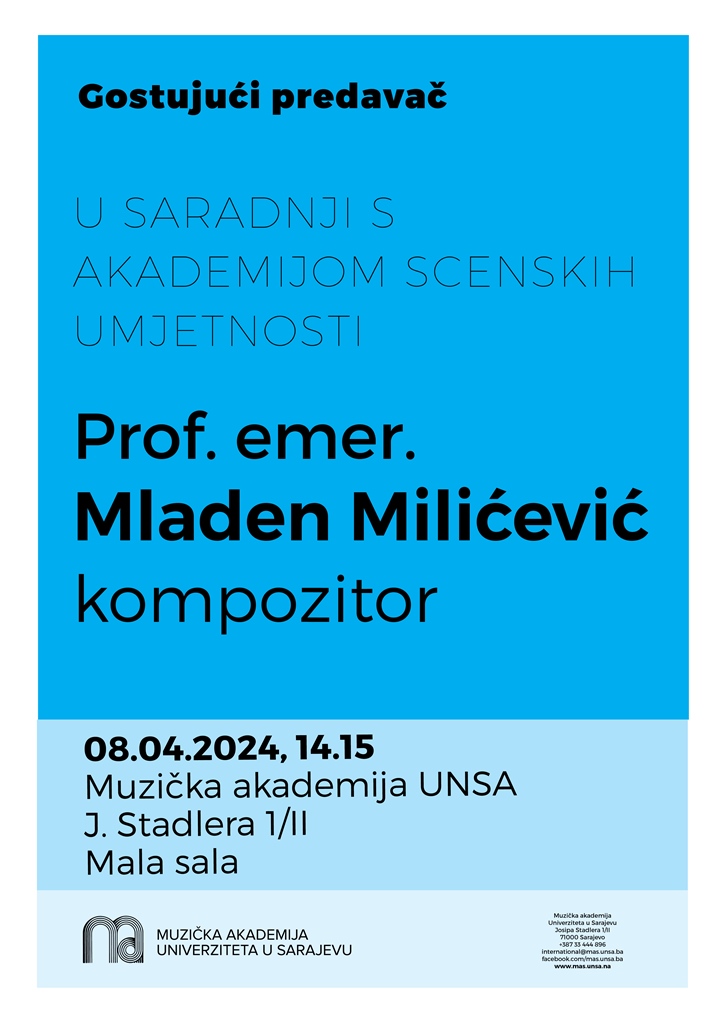 Akademija scenskih umjetnosti UNSA će u periodu od 8. do 17. aprila 2024. prirediti niz predavanja posvećenih zvuku na filmu u saradnji s istaknutim kompozitorom i profesorom iz Sarajeva sa sjedištem u Los Angelesu i Zagrebu dr. Mladenom Milićevićem. Pored objavljenog programa predavanja, prof. Milićević će za studente Muzičke akademije UNSA, pod okviru aktivnosti na predmetu Aspekti suvremene muzike, realizirati predavanje u čijem će fokusu biti njegov kompozitorski rad. Predavanje će biti održano u ponedjeljak, 08.04.2024, u 14.15. u Maloj sali MAS UNSA.