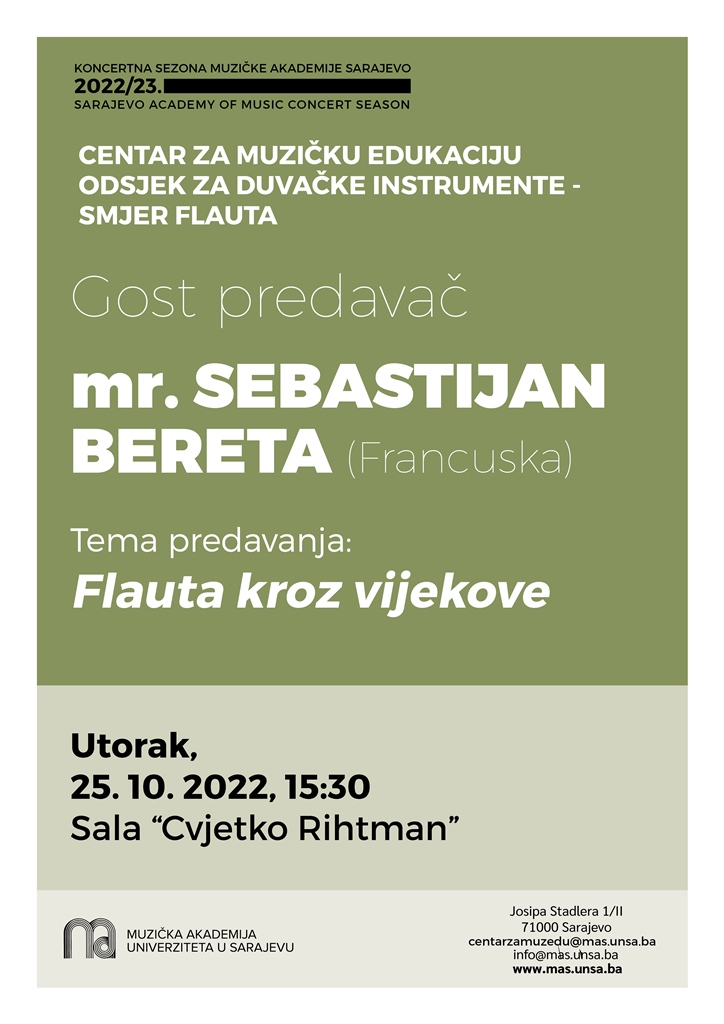 Centar za muzičku edukaciju Muzičke akademije Univerziteta u Sarajevu i Odsjek za duvačke instrumente i harmoniku – Smjer flauta, u suradnji s Odjelom za međunarodnu suradnju MAS sa zadovoljstvom najavljuje predavanje profesora flaute mr. Sebastijana Berete na temu Flauta kroz vijekove– o istoriji flaute, instrumentima korištenim u 18. i 19. stoljeću, njihovim specifikacijama, ulozi i korištenju u interpretaciji istorijske muzike. Predavanje, namijenjeno za nastavnike i učenike flaute, održat će se na Muzičkoj akademiji u Sali Cvjetko Rihtman, u utorak, 25. 10. 2022. u 15:30 sati.