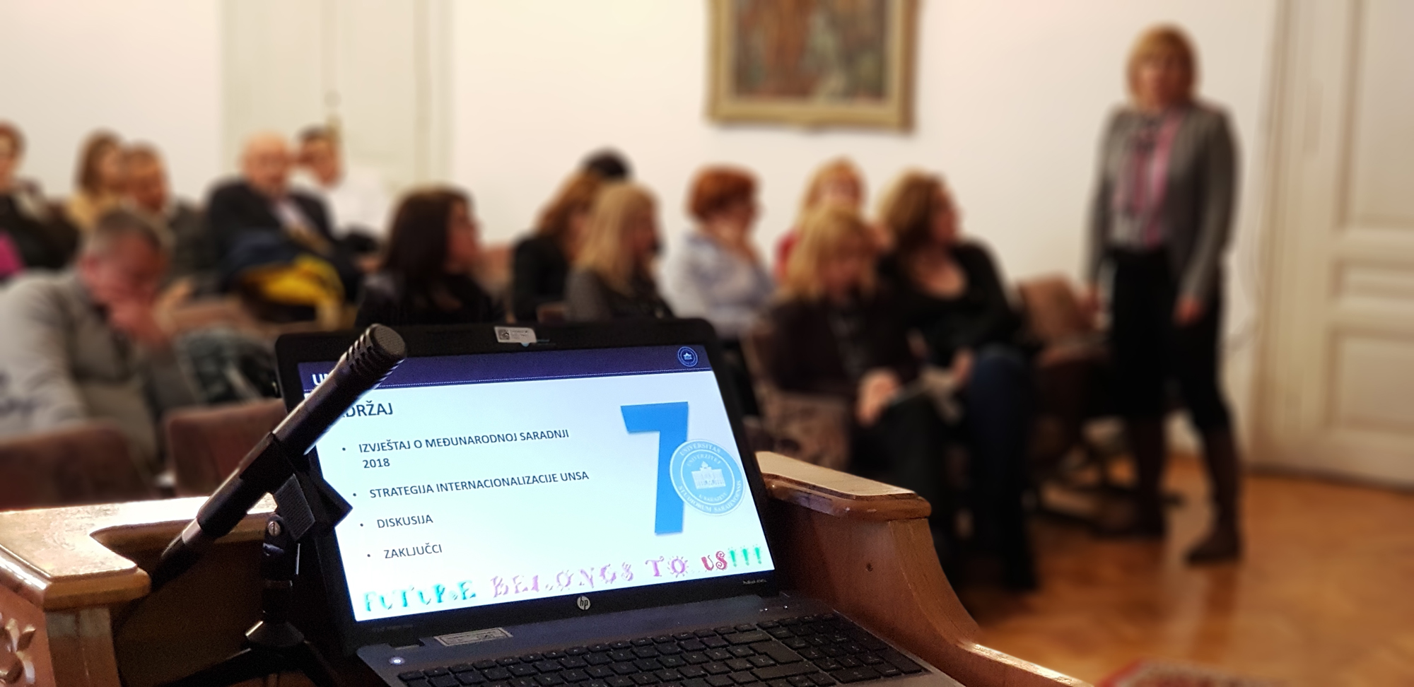 Cilj sastanka je bilo predstavljanje Izvještaja za 2018. godinu o implementaciji raznih aktivnosti iz oblasti međunarodne saradnje na UNSA, kao i doprinos naših studenata, nastavnog i nenastavnog osoblja u međunarodnim aktivnostima izvan granica Bosne i Hercegovine. Posmatrani period izvještaja je kalendarska 2018. godina, te su obuhvaćene aktivnosti iz ljetnog semestra 2017/2018. godine i zimskog semestra 2018/2019. godine.