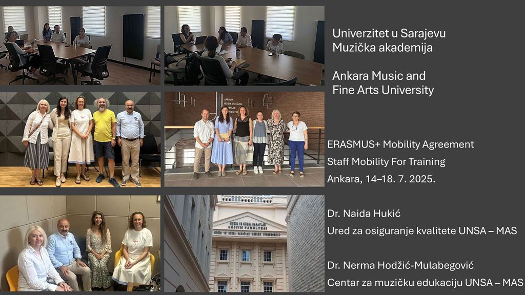 U periodu od 14. do 18. jula 2025. godine, profesorice Univerziteta u Sarajevu – Muzičke akademije dr. Nerma Hodžić-Mulabegović i dr. Naida Hukić gostovale su u Ankari (Turska) na Ankara Müzik ve Güzel Sanatlar Üniversitesi u okviru Erasmus+ K171 programa mobilnosti (Staff Mobility For Training). Tokom posjete prof. dr. Nerma Hodžić-Mulabegović je prezentirala rad Centra za muzičku edukaciju, dok je prof. dr. Naida Hukić prezentirala rad u oblasti osiguranja kvalitete na matičnoj instituciji. Posjeta je podrazumijevala i niz sastanaka sa nastavnim i nenastavnim osobljem, te razmjenu iskustava u oblasti muzičke edukacije i osiguranja kvaliteta, što je dodatno ojačalo međunarodnu saradnju između visokoškolskih ustanova i otvorilo mogućnosti za daljnje zajedničke aktivnosti.
