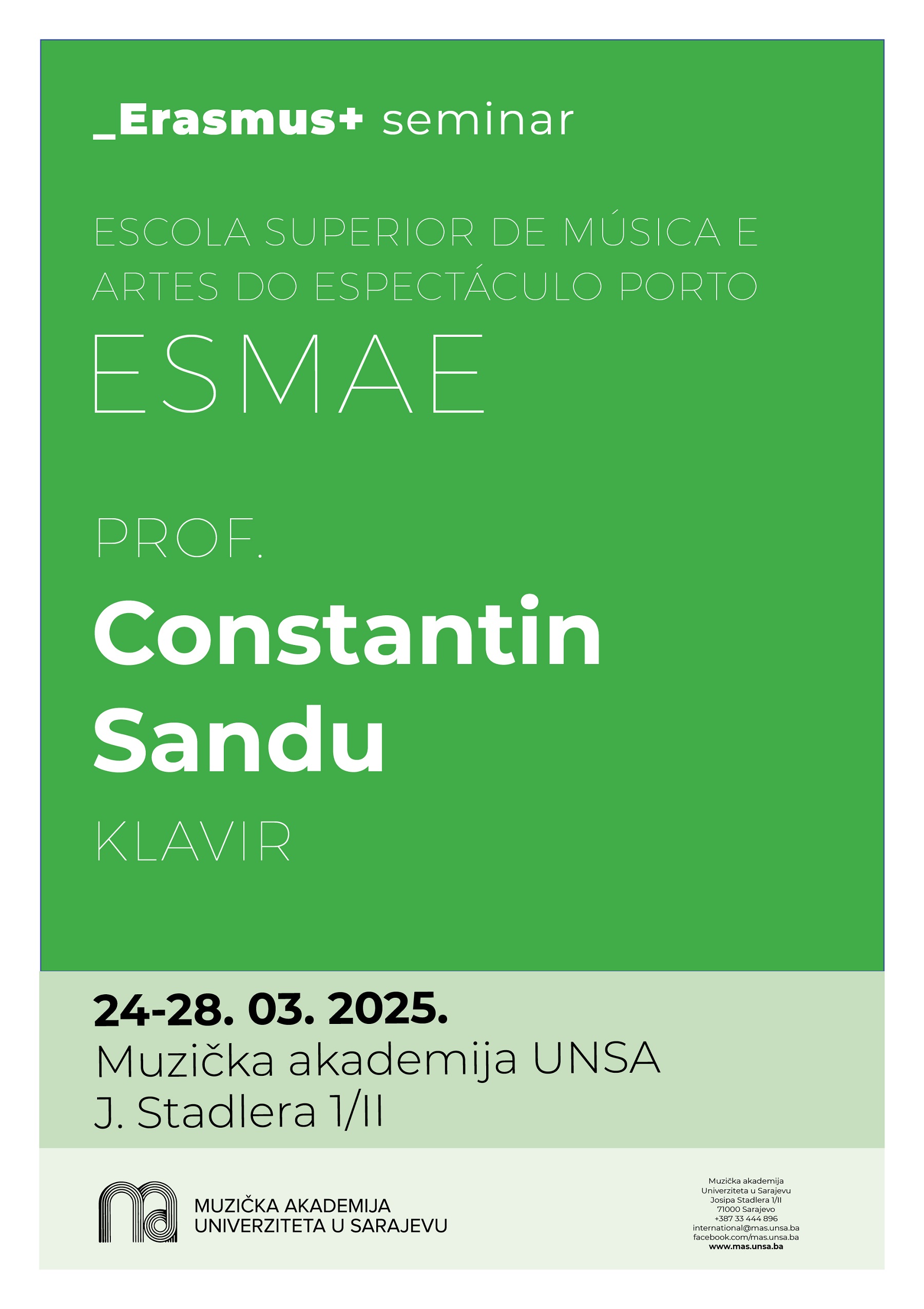 U periodu od 24. do 28. marta 2025. godine, Muzička akademija Univerziteta u Sarajevu ugostit će Constantina Sandua, pijanistu svjetskog glasa i profesora na Escola Superior de Música e Artes do Espectáculo Porto (ESMAE). Osim majstorskih radionica za studente klavira, Sandu će 26. marta u 19:00 u Galeriji Bosanskog kulturnog centra KS održati solistički recital.