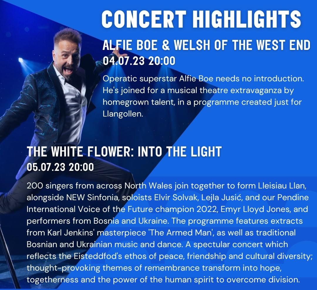 U sklopu ovogodišnjeg izdanja prestižnog svjetskog festivala LLANGOLLEN INTERNATIONAL MUSICAL EISTEDDFOD, koje je održano od 4. do 9. jula ove godine u Velsu u Velikoj Britaniji, kao vokalna solistica koncerta WHITE FLOWER INTO THE LIGHT nastupila je prof. Lejla Jusić i gitarist Elvir Solak. Ovim povodom izvedena je i autorska kompozicija "Bijeli cvijet" autora Elvira Solaka, a nizu koncerata tokom festivala prethodio je i nastup na skupu britanske dobrotvorne organizacije "Remembering Srebrenica" u Londonu u čuvenoj Lancaster House. Još od 1947. godine na Llangollen International Musical Eisteddfod festivalu, koji se svake godine održava u Llangollenu, Sjeverni Vels, nastupaju mnogobrojni pjevači, plesači i instrumentalisti iz oko 150 zemalja svijeta, pred publikom od više desetina hiljada ljudi tokom 6 dana manifestacije. Među poznatim pjevačima koji su nastupali na festivalu u Llangollenu proteklih godina su i Luciano Pavarotti, Katherine Jenkins i Montserrat Caballe.