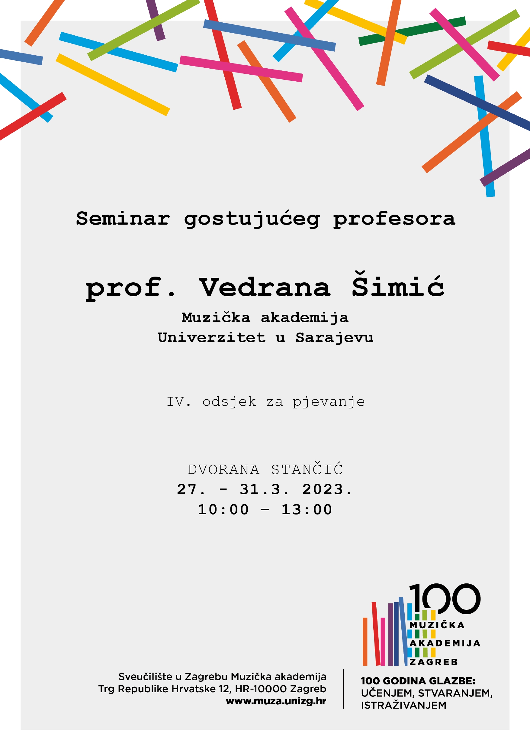 Profesorica Muzičke akademije Univerziteta u Sarajevu, Vedrana Šimić (solo pjevanje), u periodu od 27. do 31. ožujka 2023. godine boravila je na Muzičkoj akademiji Sveučilišta u Zagrebu. Posjeta realizirana u sklopu Erasmus+ teaching razmjene uključivala je rad sa studentima. Pored produktivnog rada sa studentima, uspješna realizacija posjete obuhvatila je i zajedničke razgovore sa osobljem akademije o unaprjeđivanju, te eventualnom proširivanju dugogodišnje suradnje.