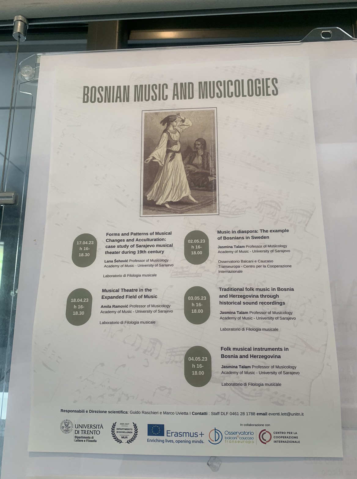 Profesorice Muzičke akademije Univerziteta u Sarajevu Amila Ramović i Lana Šehović gostovale su od 14. do 19. 3. 2023. na Fakultetu humanističkih nauka Univerziteta u Trentu (Italija). Povod za gostovanje je ciklus predavanja pod nazivom Bosnian Music and Musicologies koji navedeni univerzitet realizira u tekućoj godini. Predavanja koja su tematizirala historiografiju bosanskohercegovačke muzike te akutna sistematske istraživanja savremenih tendencija u muzici dala su okvir za predstavljanje višedecenijskog razvoja bh. muzikologije te raznovrsnosti muzikoloških oblasti koje se izučavaju na Univerzitetu u Sarajevu.
