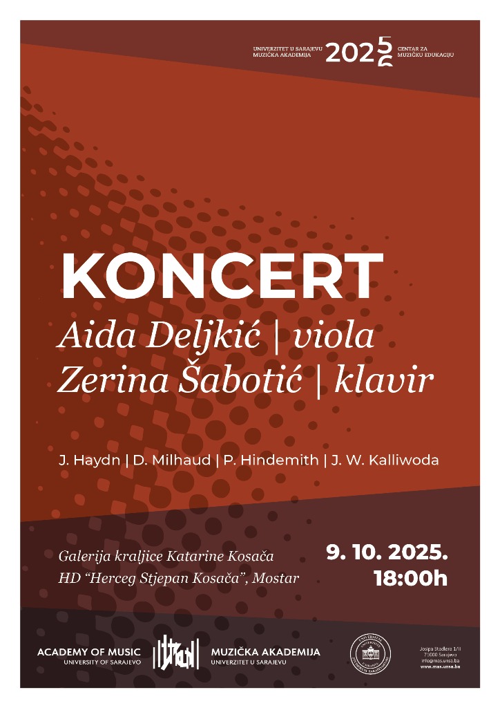 Nakon realizirane radionice i cjelovečernjeg koncerta u Tuzli (9. 6. 2025), radionica i koncert su dana 9. 10. 2025. upriličeni za učenike i nastavnike Muzičke škole I i II stupnja, Mostar i Glazbene škole Ivana pl. Zajca, Mostar. Po završetku radionice, mr. Aida Deljkić (viola) i mr. Zerina Šabotić (klavir) održale su cjelovečernji koncert u Galeriji kraljice Katarine Kosača, HD „Herceg Stjepan Kosača“, Mostar.
