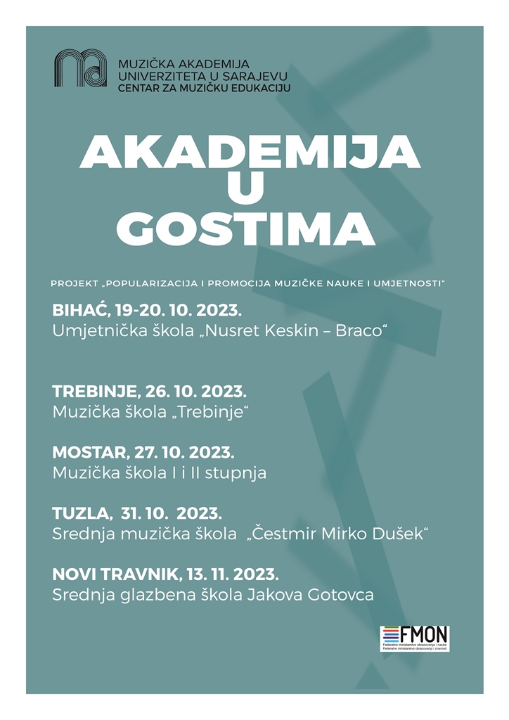 U okviru projekta "Popularizacija i promocija muzičke nauke i umjetnosti", u periodu od 19. do 20. 10. 2023. godine, nastavnici, saradnici i studenti Muzičke akademije Univerziteta u Sarajevu posjetili su Umjetničku školu "Nusret Keskin Braco", Bihać. Tom prilikom su održana predavanja i radionice za nastavnike i učenike iz predmeta: Klavir, Gitara, Klarinet, Violina, Solfeggio i Muzikologija. Predavači i voditelji radionica bili su nastavnici i saradnici: red. prof. mr. Dragan Opančić, red. prof. mr. Đani Šehu, v. ass. mr. Adnan Alagić, red. prof. dr. JeonJu Yeong, v. ass. mr. Ena Plakalo i ass. mr. Rijad Kaniža. Istim povodom upriličen je koncert "Akademija u gostima", na kojem su učestvovali studenti, nastavnici i saradnici Muzičke akademije Univerziteta u Sarajevu (program u prilogu).