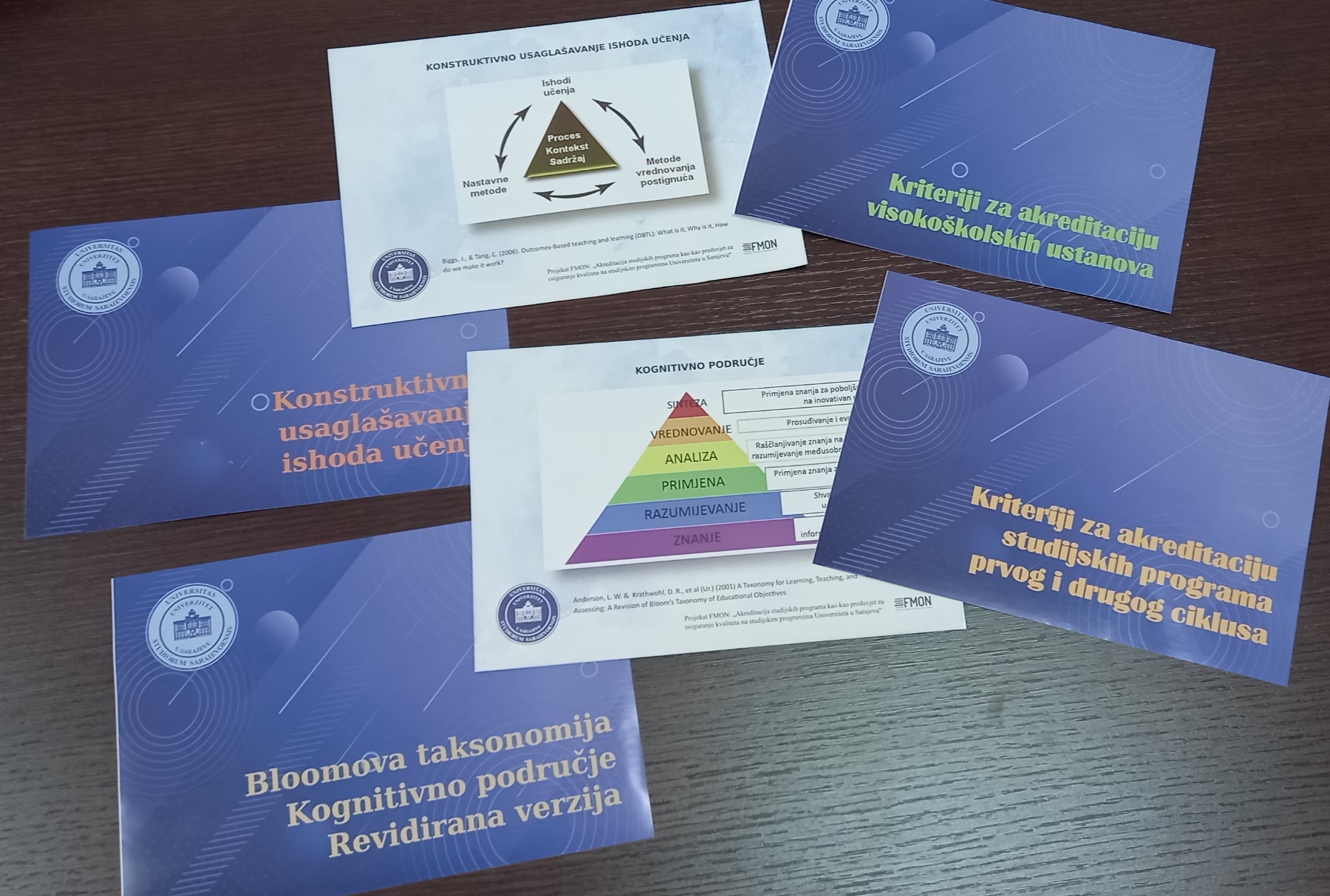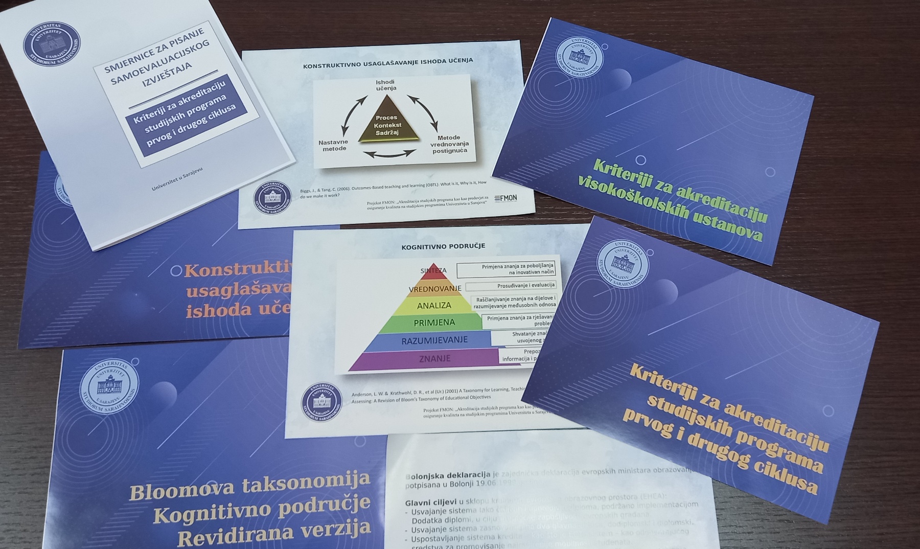 Za potrebe daljnje edukacije štampan je materijal u formi flyera i brošura, a koji sadrži osnovne informacije o važećim kriterijumima za akreditaciju studijskih programa i visokoškolskih ustanova, te uputama za pisanje samoevaluacijskih izvještaja Agencije za razvoj visokog obrazovanja i osiguranje kvaliteta Bosne i Hercegovine. Isti će se distribuirati organizacionim jedinicama Univerziteta (https://kvalitet.unsa.ba/radionice/ ).