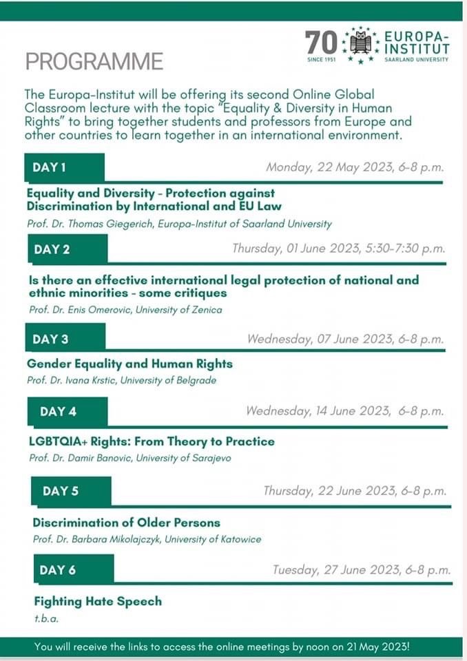 Europa Institut (Univerzitet Saarland) u saradnji sa SEEL mrežom i Transform4Europe u okviru ljetnog semestra 2023. godine organizuje drugu po redu seriju predavanja „Global Classroom“.
