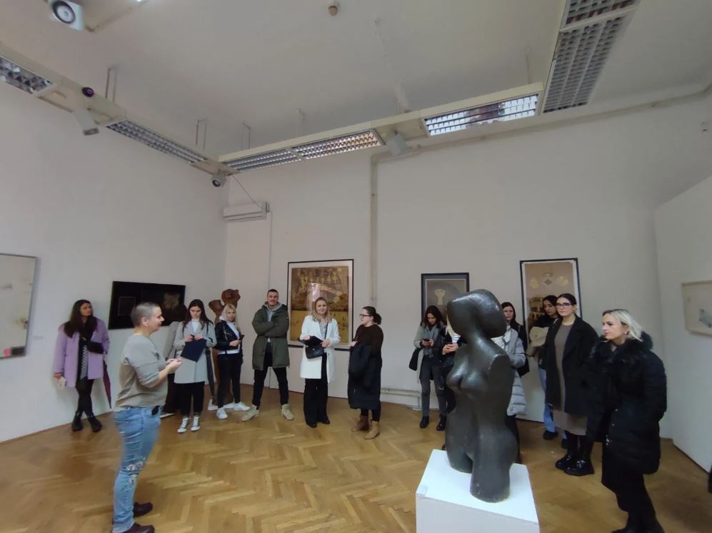 Studente i predmetnu profesoricu doc. dr. Enitu Čustović, dočekala je i kroz Galeriju vodila Aida Šarac-Berbić, muzejski pedagog Umjetničke galerije Bosne i Hercegovine. Osim kraćeg upoznavanja sa radom Galerije, studenti su mogli čuti i o trenutnim izložbama u Galeriji. Jedna od njih je i samostalna izložba Nele Hasanbegović, gdje su studenti uz Muzejskog pedagoga imali priliku kroz stručan i ugodan razgovor dati svoj osvrt na umjetnička djela. Uz pitanja koja navode na razmišljanje, razgovarali su o pristupima u interpretaciji svakodnevnih pojava, te na koji način umjetnik šalje poruku posmatraču. Također, osvrnuli su se i na instalaciju Enesa Sivca “Biciklista na žici” koja se nalazi iznad rijeke miljacke, a postavljena je 1992. godine, što joj dodatno daje na značaju. Znanja studenata dodatno su obogaćena i objašnjenjem elemenata umjetničkih djela i značenju određenih simbola.