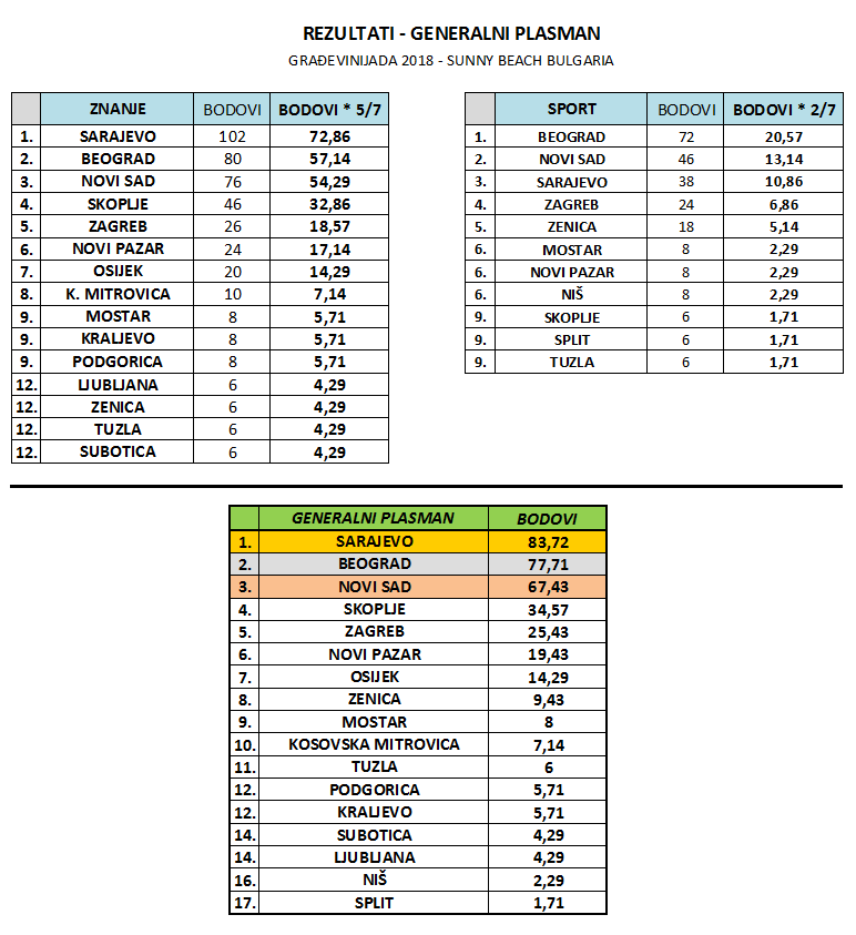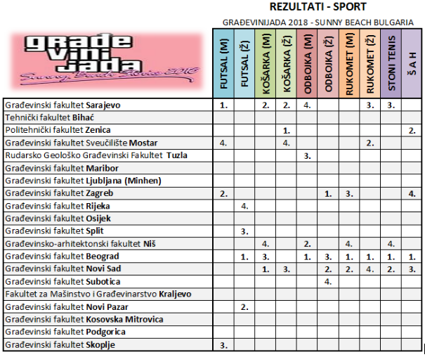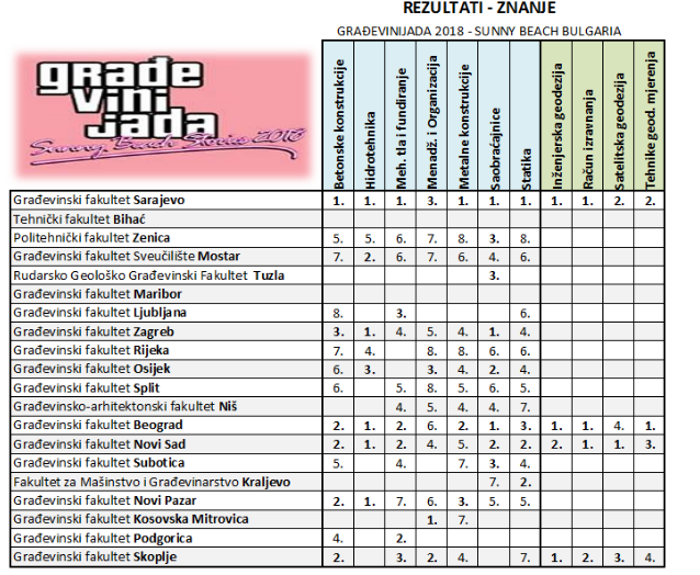 Na ovogodišnjoj, Građevinijadi 2018. Građevinski fakultet Univerziteta u Sarajevu je osvojio čak 16 medalja (od ukupno 21), čime je postavio rekord na ovom takmičenju. Devet je bilo prvih mjesta, 4 druga i 3 treća mjesta. U kvizu znanja su osvojili medalje iz svih 11 predmeta od čega je čak 8 bilo zlatnih. U sportskom dijelu takmičenja osvojili su 5 medalja (od ukupno 10), od čega je jedno 1. mjesto, 2. druga mjesta te dva 3. mjesta.