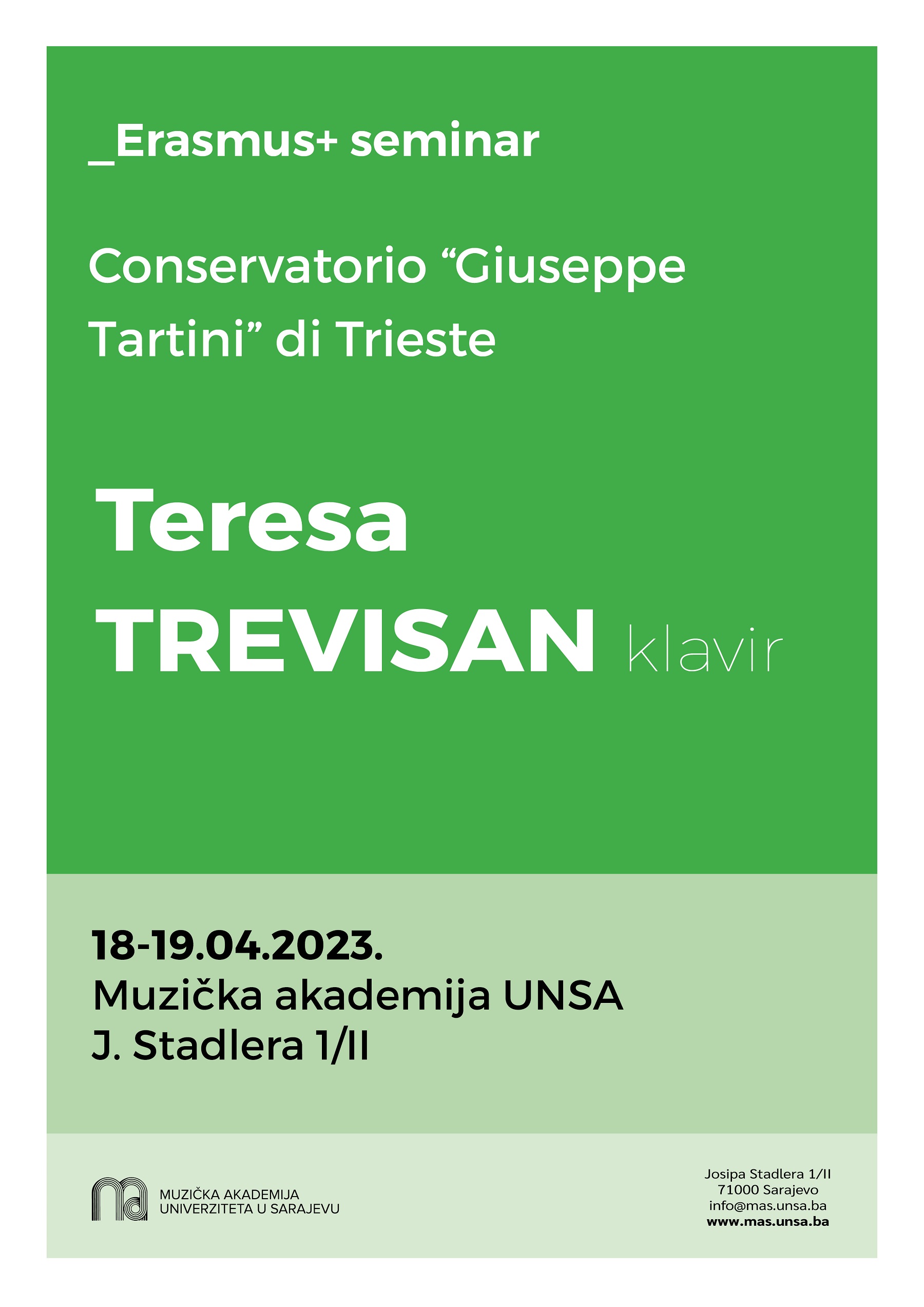 Univerzitet u Sarajevu – Muzička akademija najavljuje gostovanje Terese Trevisan, priznate pijanistice i profesorice na Conservatorio “Giuseppe Tartini” di Trieste koje se realizira kao dio programa akademskih razmjena u okviru dugogodišnje saradnje ove dvije institucije.