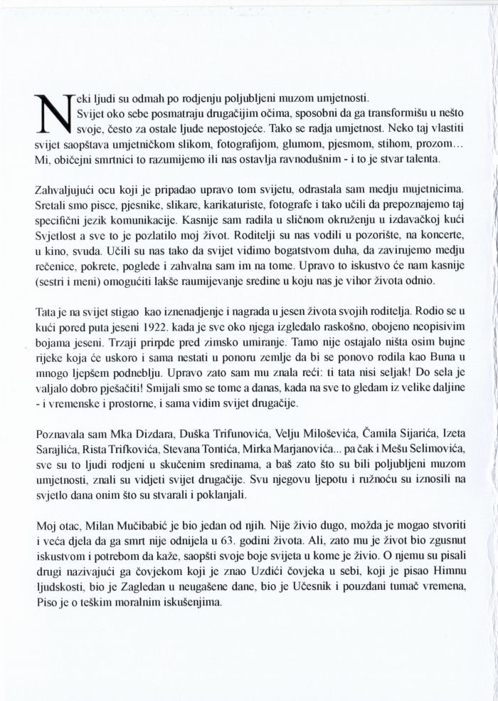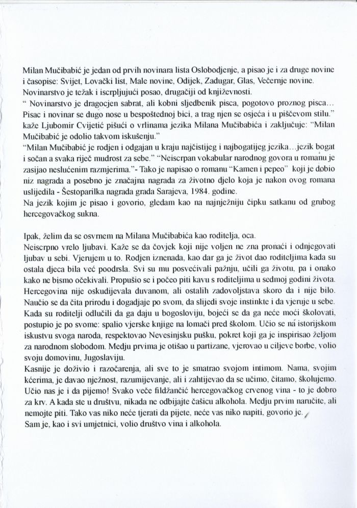 Prije stotinu godina rođen je prozni pisac, pjesnik i novinar, dobitnik Šestoaprilske nagrade Grada Sarajeva Milan Mučibabić. Pripovjedačku vještinu i odnjegovan jezik, demonstrirao je podjednako u pričama i romanima, kao i u novinskim zapisima i reportažama. Suština njegovog odnosa prema ljudima i vremenu, i u životu i u književnosti jeste dosljednost u zalaganju za istinu.