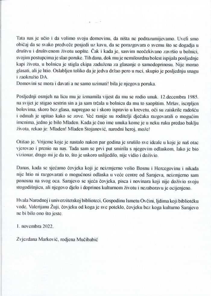 „Moj otac nije dugo živio, možda je mogao stvoriti i veća djela da ga smrt nije odnijela u 63. godini. Ali, zato mu je život bio zgusnut iskustvom i potrebom da kaže, saopšti svoje boje svijeta u kome je živio. O njemu su pisali drugi nazivajući ga čovjekom koji je znao Uzdići čovjeka u sebi, koji je pisao Himnu ljudskosti, bio je Učesnik i pouzdani tumač vremena, pisao je o teškim moralnim iskušenjima“, navela je u svom govoru, gđa. Marković.