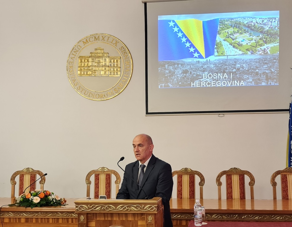 "Bosna i Hercegovina je zemlja koja je sa ozbiljnom tradicijom višestoljetne države i mi kao akademska zajednica ovim putem poručujemo međunarodnoj zajednici, posebno visokom predstavniku, da uz primjenu svih mehanizama koji mu stoje na raspolaganju utječe i na domaće politike i na međunarodnu zajednicu da se život građana Bosne i i Hercegovine učini sigurnim i ekonomski prosperitetnim", naveo je rektor Škrijelj.
