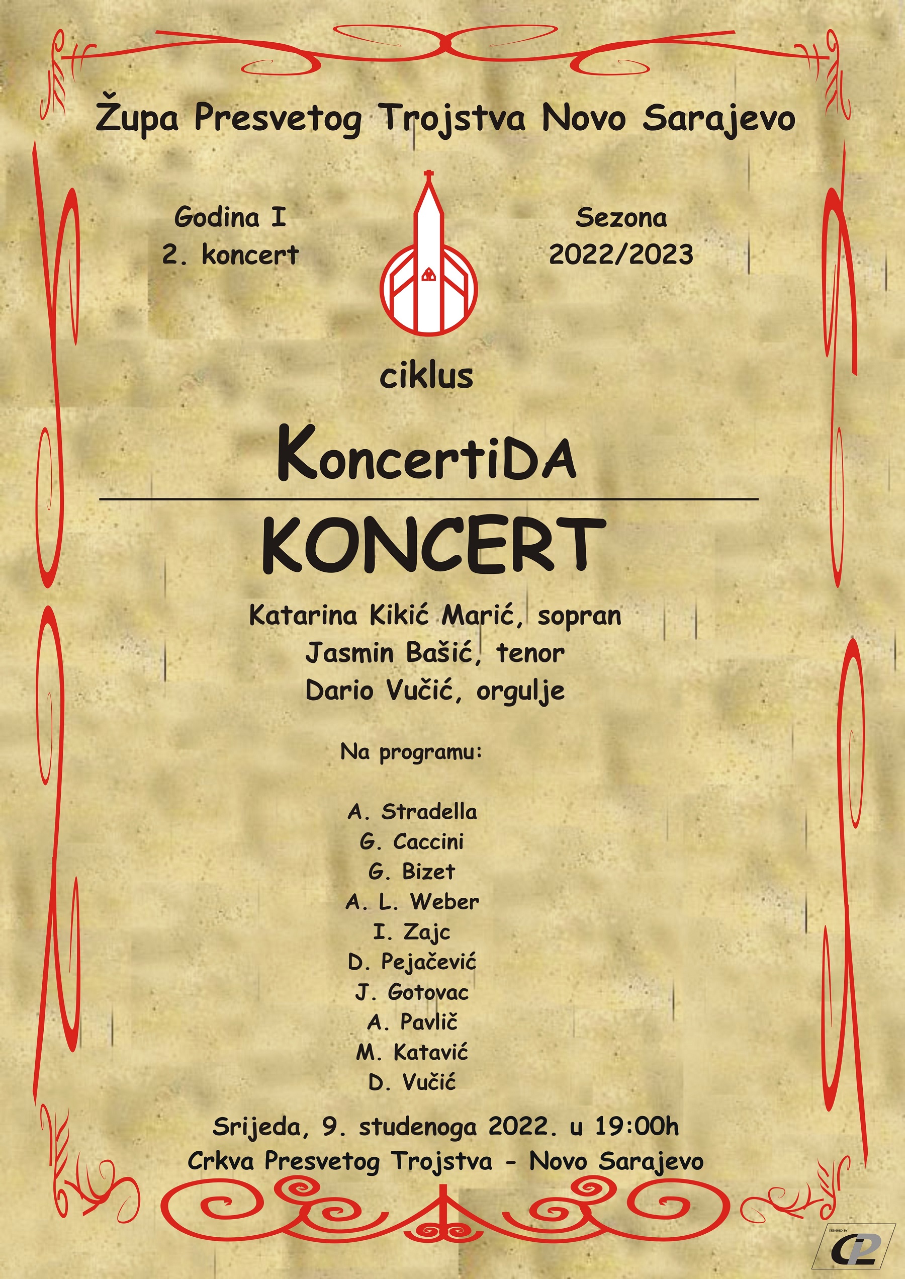 U crkvi Presvetog Trojstva u Novom Sarajevu u sklopu ciklusa KoncertiDA bit će održan drugi koncert na kojem će nastupiti solisti Opere Narodnog pozorišta Sarajevo Katarina Kikić Marić, sopran i Jasmin Bašić, tenor, uz orguljsku pratnju maestra Darija Vučića, vanrednog profesora na Odsjeku za dirigovanje Muzičke akademije UNSAi dirigenta Opere.