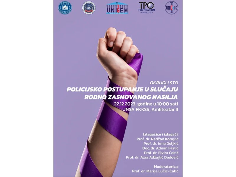 U petak, 22. decembra 2023., u sklopu projekta UNIGEM i kampanje “16 dana aktivizma” na Fakultetu za kriminalistiku, kriminologiju i sigurnosne studije (FKKSS) Univerziteta u Sarajevu (UNSA) održan je okrugli stol na temu “Policijsko postupanje u slučaju rodno zasnovanog nasilja”.