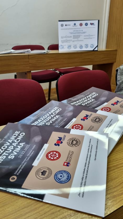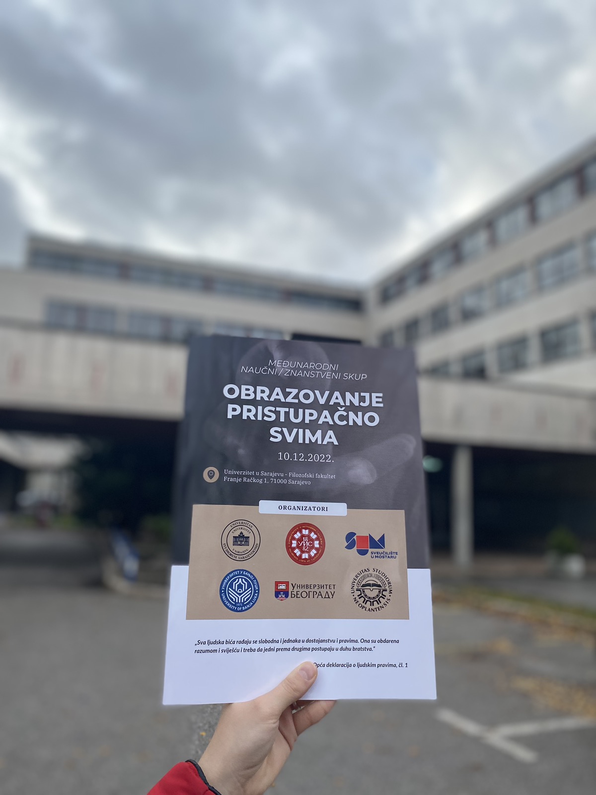 U subotu 10. 12. 2022. godine na Filozofskom fakultetu Univerziteta u Sarajevu održan je međunarodni naučni/znanstveni skup „Obrazovanje pristupačno svima“ koji su otvorili Veronika Vashchenko, zamjenica predstavnice UNICEF-a Bosne i Hercegovine, prof. dr. Rifat Škrijelj, rektor Univerziteta u Sarajevu, i prof. dr. Lejla Kafedžić, predstavnica ureda/centara za podršku studentima (sa invaliditetom) univerziteta/sveučilišta iz Bosne i Hercegovine i Srbije.