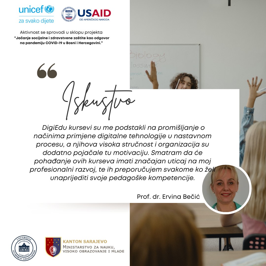 DigiEdu online platforma je osmišljene da pomogne nastavnicima da poboljšaju svoje digitalne i pedagoške kompetencije, te pruža priliku za razvoj visokokvalitetnog, inkluzivnog i dostupnog visokog obrazovanja. DigiEdu platforma je rezultat nesebičnih ulaganja naših partnera i donatora: Ministarstva za nauku, visoko obrazovanje i mlade, UNICEF-a i USAID-a i Erasmus+ PARTISH projekta. Platforma će biti dostupna nastavnom osoblju svih nivoa obrazovanja, kao i budućem nastavnom osoblju, a pruža niz inovativnih alata i resursa za podršku nastavnicima u razvoju njihovih vještina i korištenju savremenih nastavnih metoda.
