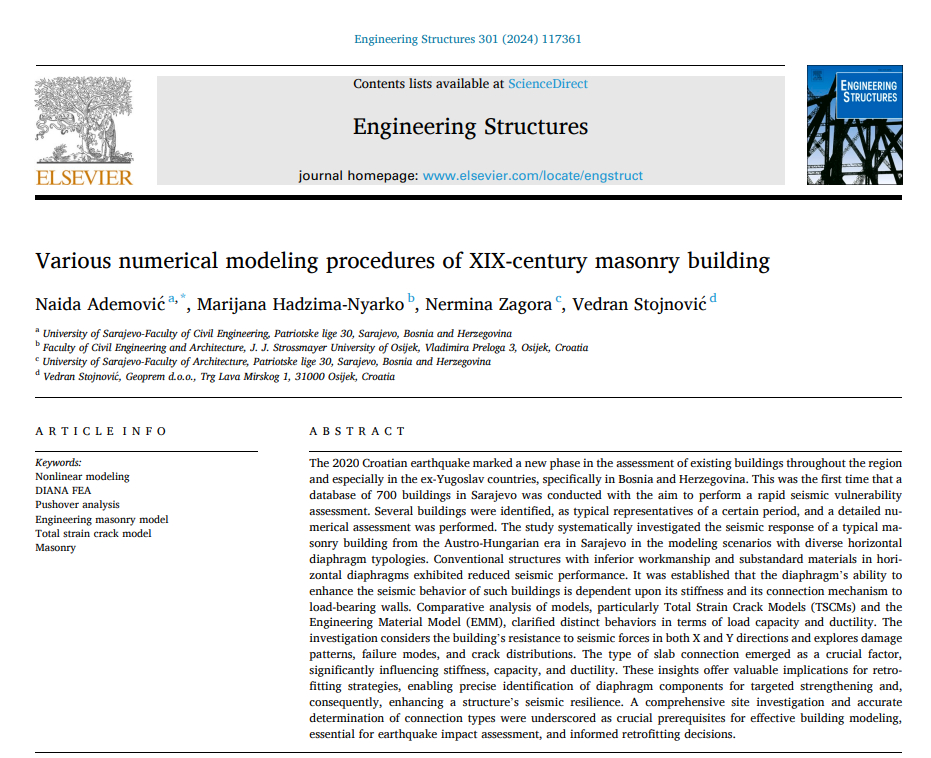 Prof. dr. sci. Naida Ademović, dipl. građ. ing., zajedno sa saradnicima, vanr. prof. dr. sci. Nerminom Zagorom, dipl. arh. ing. sa Arhitektonskog fakulteta Univerziteta u Sarajevu, prof. dr. sci. Marijanom Hadzima-Nyarko sa Sveučilišta J. J. Strossmayera u Osijeku, Građevinski i arhitektonski fakultet Osijek, te Vedranom Stojnovićem, mag. ing. geod. et geoinf. iz GEOprem d.o.o., objavila je originalni naučno-istraživački rad pod nazivom Various numerical modeling procedures of XIX-century masonry building“ u prestižnom časopisu Engineering Structures (IMPACT FACTOR 5.5, Journal Impact Quartile Q1).