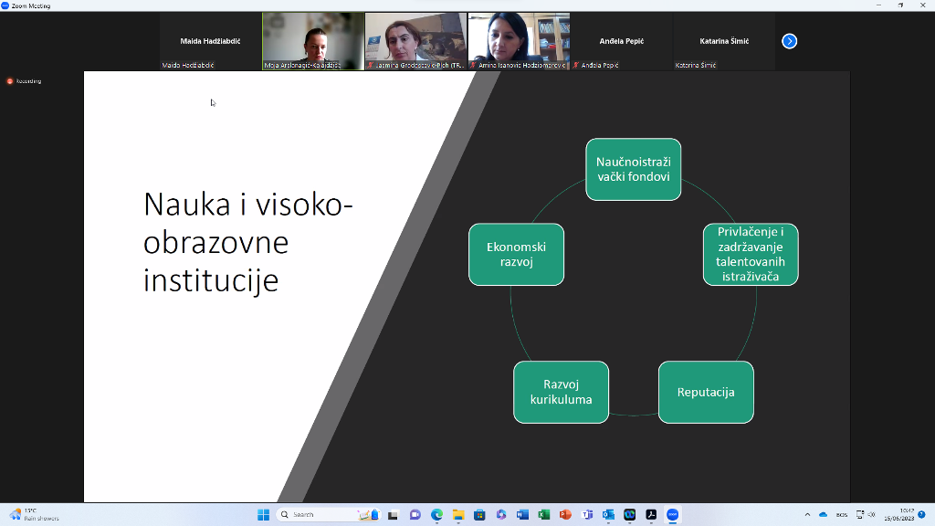 Webinar „Jačanje istraživačkih kapaciteta na javnim univerzitetima u BiH“ održan je 15. juna 2023. godine u sklopu projekta „Razvoj okvira stručnog usavršavanja akademskog osoblja na javnim univerzitetima u BiH – TRAIN BiH 2022/2023“ i u saradnji sa svim javnim univerzitetima u BiH.