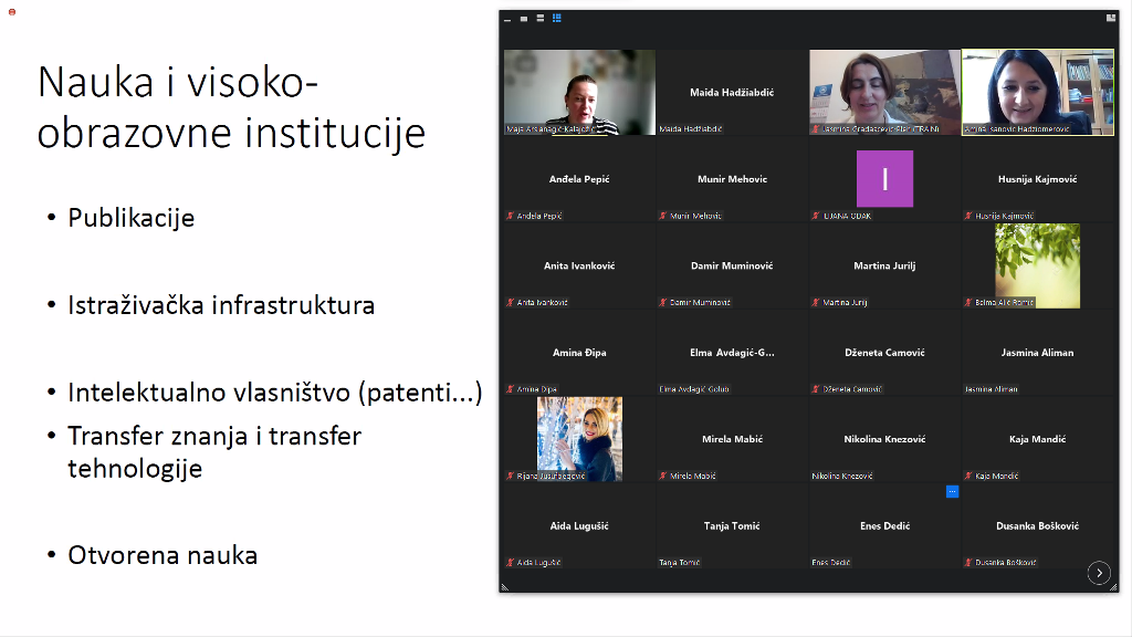 U prvom dijelu webinara prof. dr. Maja Arslanagić-Kalajdžić sa Univerziteta u Sarajevu osvrnula je se na značaj naučnoistraživačkog rada u fuknciji razvoja visoko obrazovanih institucija i društva. Dr. Anđela Pepić sa Univerziteta u Banjoj Luci je se u svom izlaganju osvrnula na načine jačanja istraživačkih kapaciteta kroz učešće u Horizon Europe i COST akcijama. Webinar je moderirala doc. dr. Amina Isanović-Hadžiomerović sa Univerziteta u Sarajevu koja je ujedno i članica tima TRAIN BiH projekta.