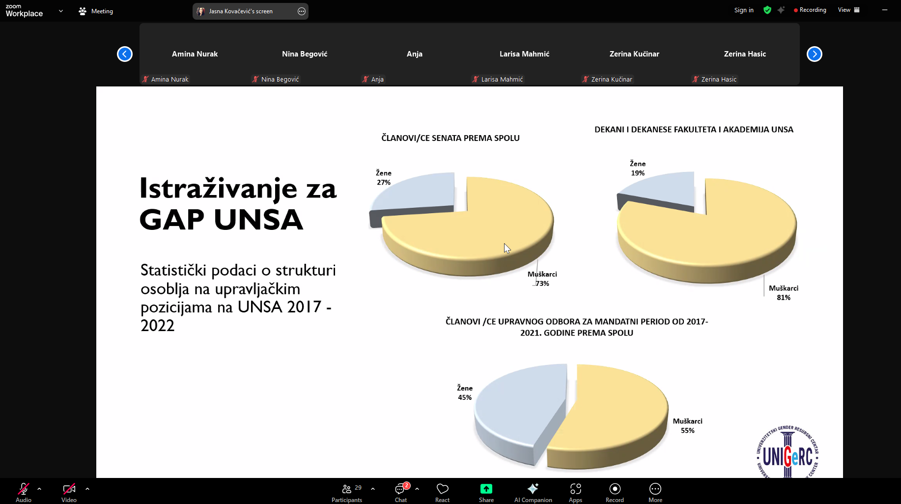 U uvodnom dijelu webinara učesnice i učesnike je pozdravio prof. dr. Naris Pojskić, prorektor za naučnoistraživački rad Univerziteta u Sarajevu istakavši da je evidentno da se u današnje vrijeme univerziteti suočavaju sa brojnim globalnim izazovima kao što su demografske promjene, klimatske krize, tehnološki razvoj i socioekonomska nejednakost, i da se od univerziteta očekuje da preuzmu aktivnu ulogu u oblikovanju društva. U nastavku je prorektor Pojskić naglasio da je upravo pitanje rodne jednakosti (gender equality) jedan od izazova koji zaokupljuje moderna i razvijena društva, kao i ona u razvoju i da Evropska unija kroz Strategiju rodne jednakosti 2020 – 2025. godina jasno ističe svoju stratešku opredijeljenost da unaprijedi rodnu jednakost. Univerzitet u Sarajevu je u proteklom periodu pokrenuo određene institucionalne korake od kojih se očekuje da će doprinijeti unapređenju rodne jednakosti i svakako će i u budućnosti nastaviti da podstiče preispitivanje pristupa i prilagođavanje potrebama savremenog razvoja kako bi kreirao okruženje u kojem će se svi osjećati motivirani da doprinesu zajedničkoj misiji Univerziteta.