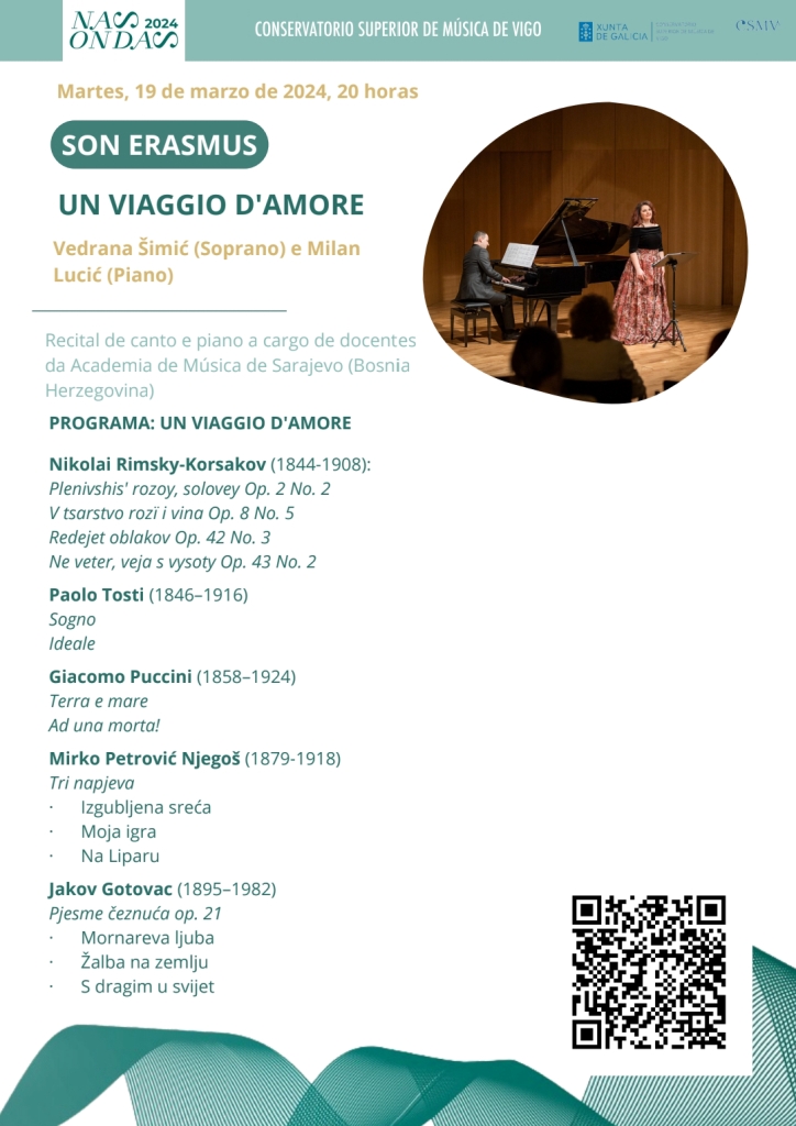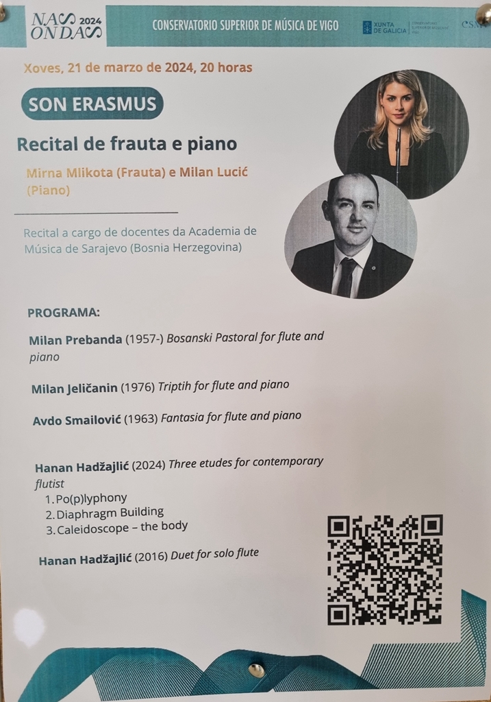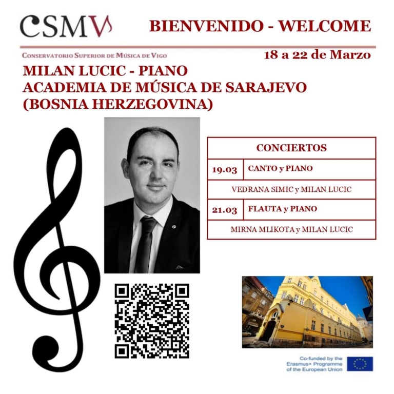 Viši umj. sar. dr. Milan Lucić boravio je na Conservatorio Superior de Musica de Vigo (Španija), u periodu od 18. do 22. marta, u okviru Erasmus+ programa. Posjeta je obuhvatila masterclass te dva recitala, za glas (Vedrana Šimić) i klavir te za flautu (Mirna Mlikota-Dizdarević) i klavir.