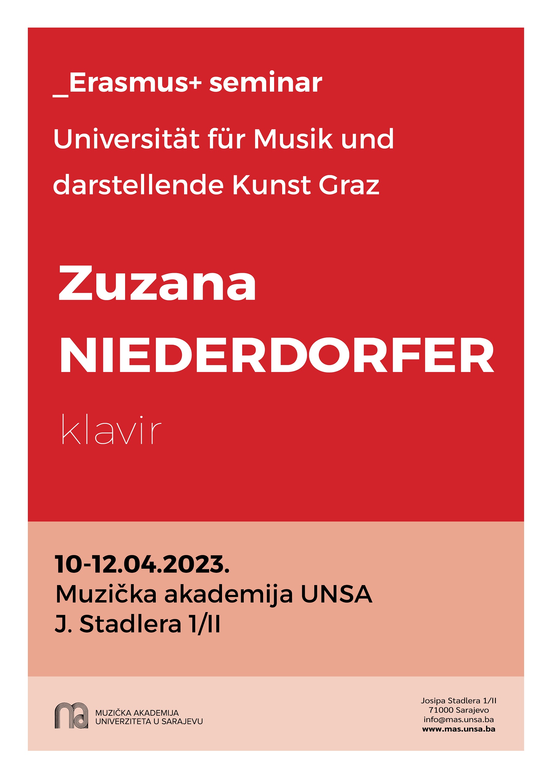 Muzička akademija Univerziteta u Sarajevu (MAS UNSA) sa zadovoljstvom najavljuje gostovanje Zuzane Niederdorfer, istaknute pijanistice i profesorice na Universität für Musik und darstellende Kunst Graz koje se realizira u okviru projekta Erasmus+ kao rezultat kontinuirane saradnje ove dvije institucije.